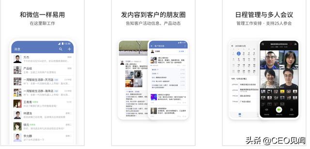 企业微信:让企业都有自己的微信,沿用微信的使用习惯,软件上手快;沿用微信的“人性化”设计,让企业级应用也有温度。企业中的员工都变成熟人,员工与员工之间的交流变成熟人之间的交流,不但面向大企业内部的沟通交流、也意在挖掘企业内部生态圈。https://work.weixin.qq.com/