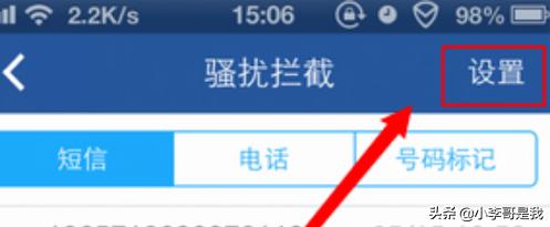 4、打开骚扰拦截功能后,继续点击右上角的设置标志,进入手机的设置界面。