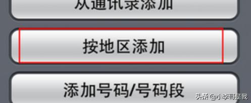 6、打开黑名单功能后,点击下面的添加,然后选择【按地区添加】,在这里面输入省份或者城市,这样的话,你以后就不用担心其他省给你打骚扰电话了。
