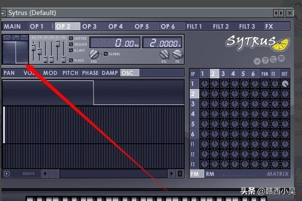 4、到了这一部接下来很关键了,在这个音色中我们要做的就是用op2去调制op1所以我们回到op2将op2的波形类型改为square 也就是方形波了,如图这一部很关键的波形类型选不对就会影响音色的相似程度!所以在这里要注意了,还有就是方形波也有很多参数,在这里可以通过osc进行调制可以个性的选择方波的类型了