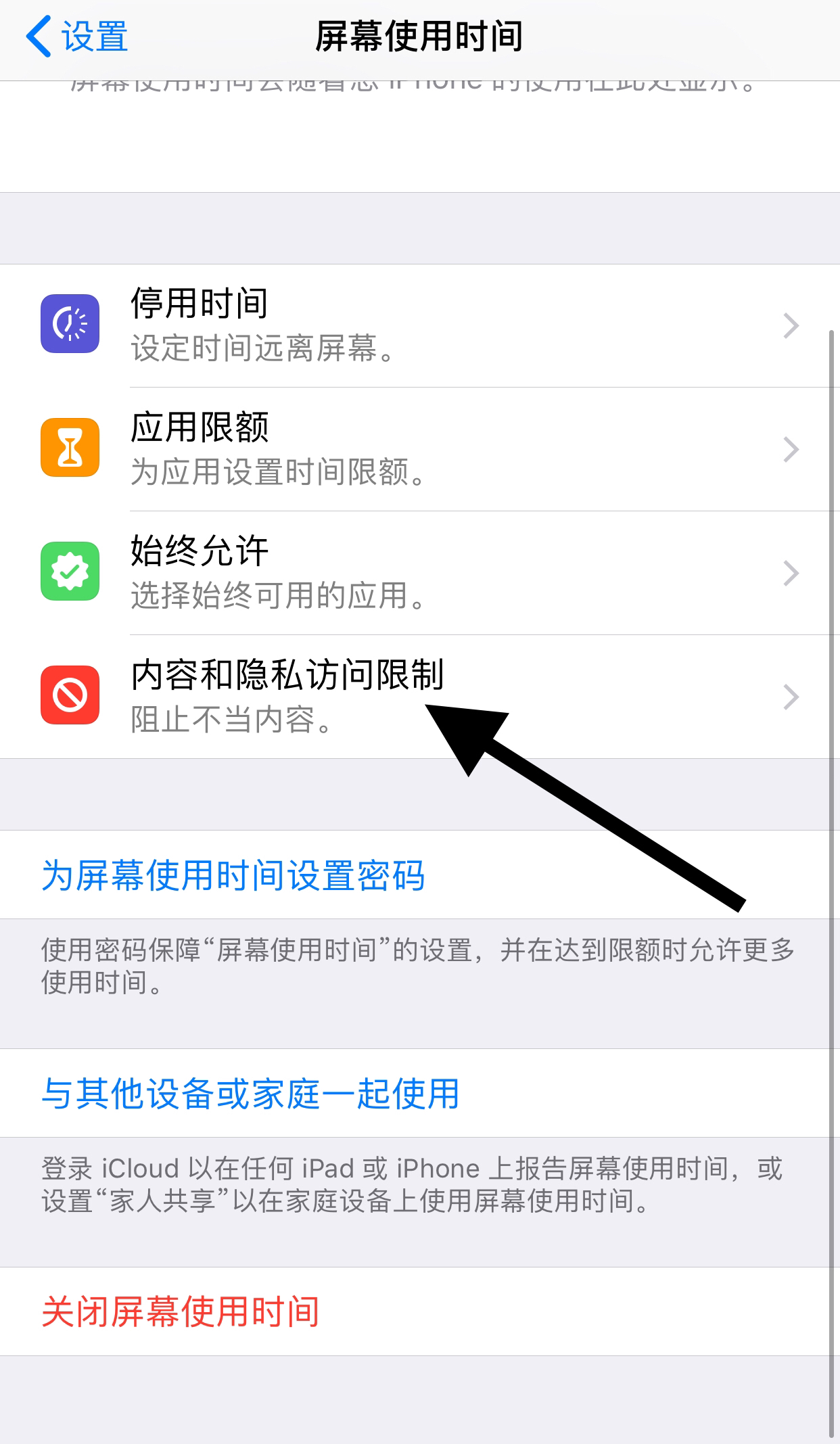 2.进入屏幕使用时间页面后,找到内容和隐私访问限制选项,打开