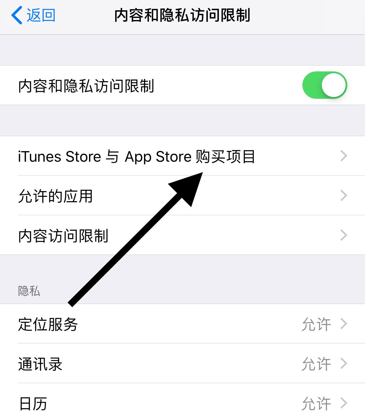 3.进去内容和隐私访问限制页面,找到iTunes Store 与App Store 购买项目选项,打开