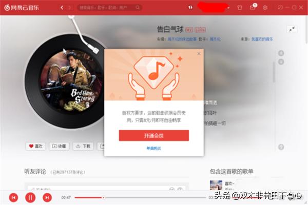 2.选择一首你想要听的音乐,以《告白气球》为例,当我们点击下载时显示未付费歌曲不能下载