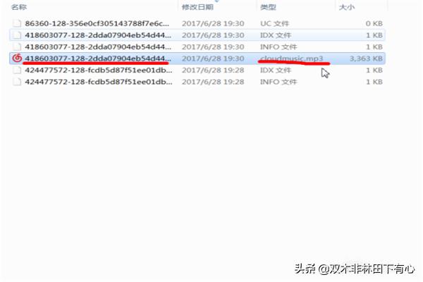 5.我们会发现在我们在线听歌后多出了一个uc文件,没错这就是网易云音乐的缓存文件。这时候我们只需要修改它的后缀名为MP3,就可以得到我们需要的付费音乐了(红线画的即为我们刚才听的《告白气球》,有强迫症的可以再去修改音乐名)