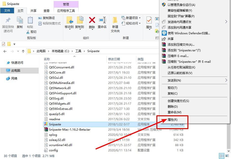 1、 打开出现错误提示“0xc0000022”的应用程序.exe文件,选择“属性”