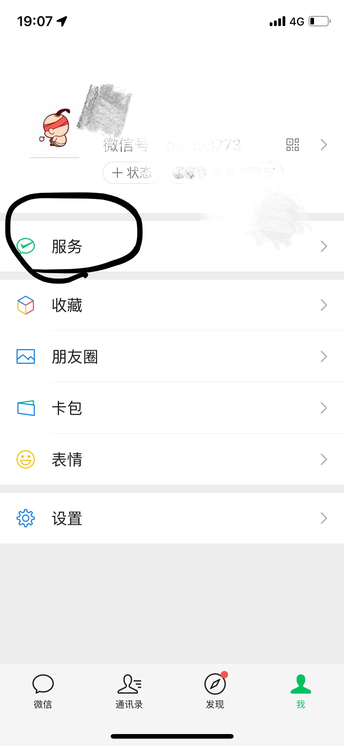 1.打开微信,点击服务。