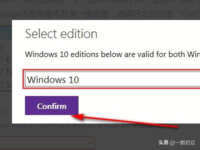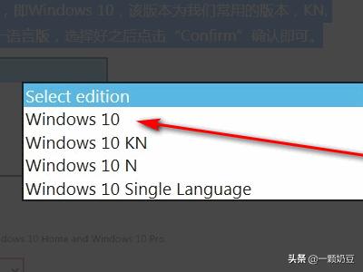 5. 选择Windows版本,我们选择第一个,即Windows 10,该版本为我们常用的版本,KN,N,Single Language为定制版本及单一语言版,选择好之后点击“Confirm”确认即可。