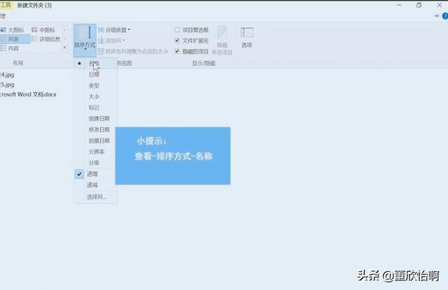 1、选中图片,点击“查看”选中“排序方式”中的“名称”。