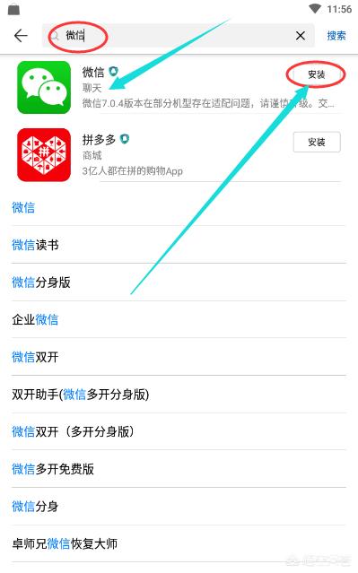 打开【应用市场】搜索你想安装的app,如:微信、QQ之类,在搜索到需求app后选择后面的安装,即开始下载app程序包。