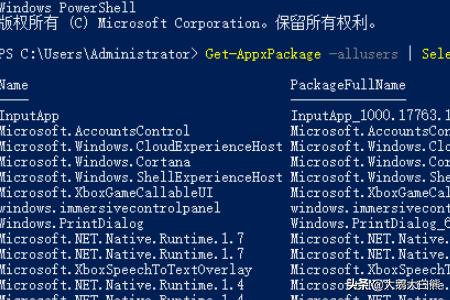 4、在代码录入页面输入“Get-AppxPackage -allusersSelectName,PackageFullName”,这样就看到了win10系统初始自带的一些程序。