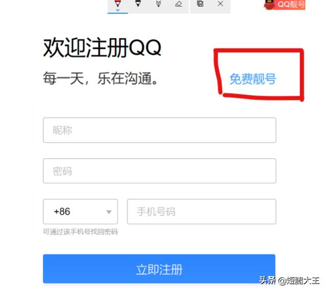 3、然后我们就可以进入注册页面,然后在页面的右上方的位置找到免费靓号,点击免费靓号。