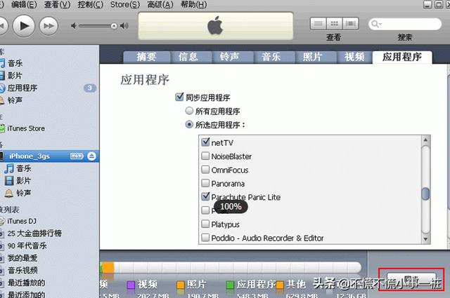 这时要用数据线联接iPhone和电脑,然后在iTunes里选择iPhone,在右边“应用程序”栏目下勾选刚才下载的游戏Parachute Panic Lite。最后点“同步”按钮,来同步安装游戏到iPhone内。如果你是用别的方式直接将ipa下载到你的电脑上(一般是已经越狱的用户),直接双击ipa文件就会加载到itunes内,在这里选择后便可同步到iPhone手机内。