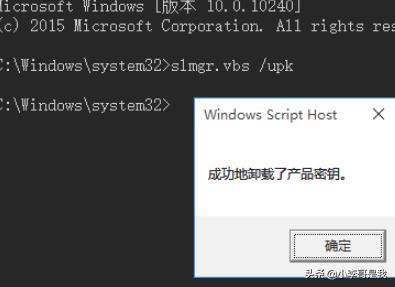 4、此时将“以管理员身份”打开“MSDOS”窗口,在此界面中,依次输出以下命令:slmgr.vbs /upk复制以上命令,并在MSDOW窗口中右击以粘贴此命令,按回车进行确定。此时弹出窗口显示“已成功卸载了产品密钥”。