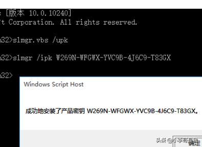 5、接着输入以下命令:slmgr /ipk W269N-WFGWX-YVC9B-4J6C9-T83GX弹出窗口提示:“成功地安装了产品密钥”。