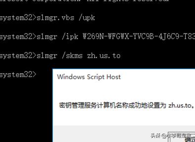 6、继续输入以下命令:slmgr /skms zh.us.to弹出窗口提示:“密钥管理服务计算机命名成功的设置为zh.us.to”。