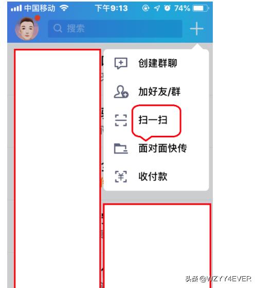 3、打开QQ扫一扫功能,QQ快捷操作菜单,点击“扫一扫”,打开QQ扫一扫功能。