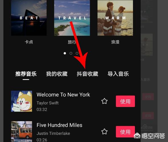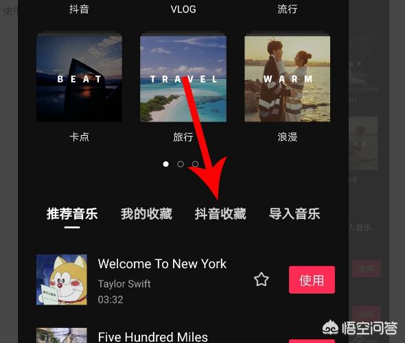 2、打开添加音乐界面点击“收藏”,然后点击音乐右侧的“使用”按钮,位置见下图。