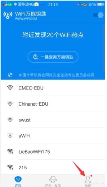 打开WiFi万能钥匙,点击“我”。