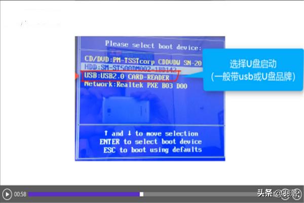 4.在进入系统启动菜单中选择带有USB字样的选项并回车。