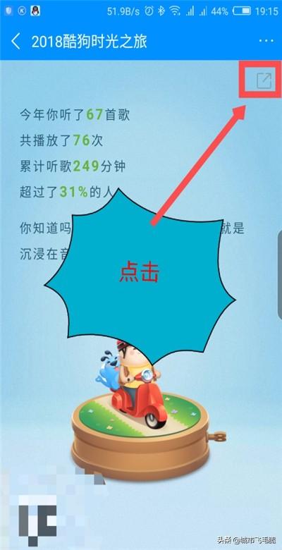 5、听歌报告也可以分享到朋友圈或者微信好友,点击右上角的分享选项,一个箭头图标。如图所示