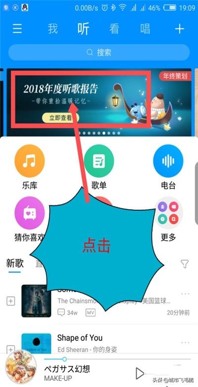 2、打开酷狗软件后,在打开的听的界面,能看到上面有一个滚动的卡片,滑动卡片找到年度听歌报告,点击打开。如图所示