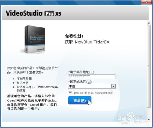 6、计算机重启之后,运行会声会影x5程序,输入电子邮件地址,选择国家或地区,点击注册会声会影。