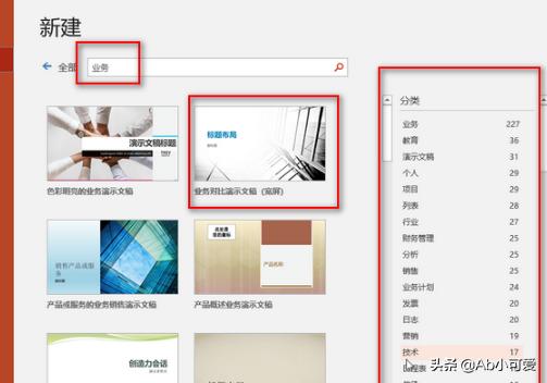 3、例如我们点击了“业务”这一类别,就会看到很多和“业务”相关的ppt模板。而在界面右侧,可以看到很多细分的类别,根据需要可以切换成别的类别。或在左侧点击自己觉得不错的幻灯片模板。