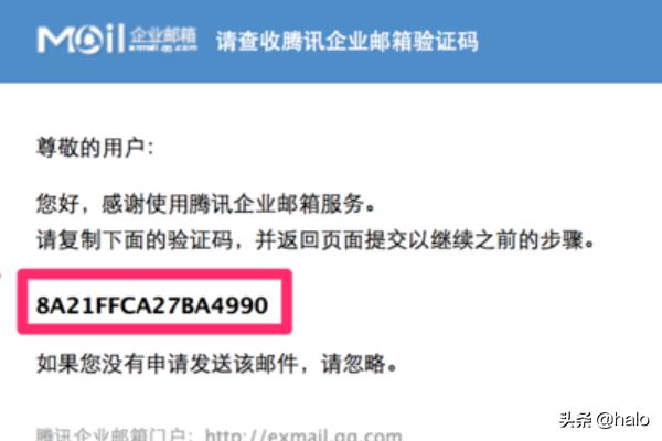 4、此时需要打开自己的密码邮箱,登录邮箱并从中找到刚才腾讯企业邮箱发布的相关邮件,点击打开,找到验证码并复制进入下一步。
