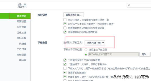 1、用浏览器下载不了,一直需要外接软件来帮助的话,那你要检查一下你的设置了!点击浏览器的右上角-工具-选项,点开之后,你会看到这样一个界面,在基本设置里,有个下载设置,如果你的浏览器没办法直接设置,你就可以在这里看到它是选择了使用迅雷或者其他下载软件下载,这样就成了要求,这个时候你只需要把它改回来!