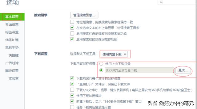 2、把浏览器的下载设置改为使用内建下载,然后根据你的实际需要,重新选择下载的保存位置: