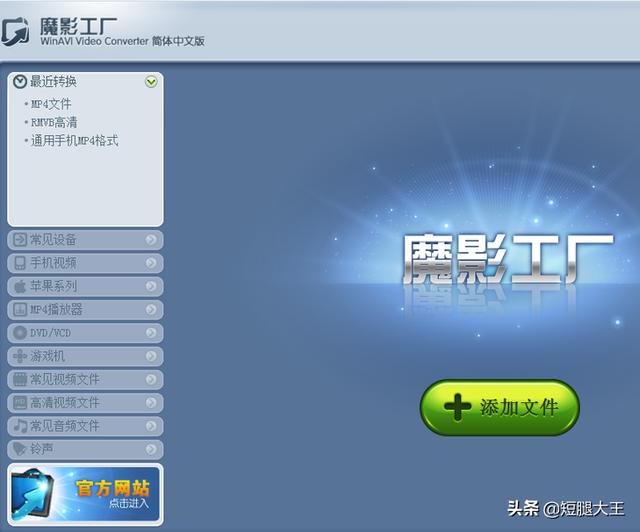 1、首先,请下载安装魔影工厂软件,如果已经装好,请打开软件,如图,即为魔影工厂的程序界面,我们点击"添加视频"