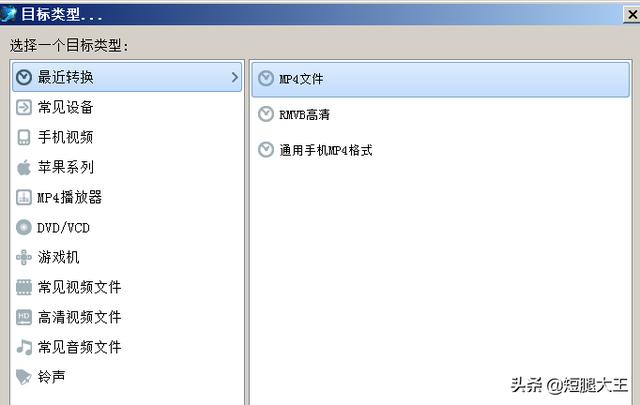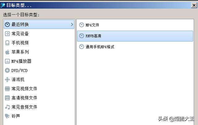 4、如果我们要转换成手机视频的话,请选择MP4,最好选择3GP,因为3GP的格式在手机上兼容性最好,不过因为MP4的通用性,所以我们也可以选择MP4,这里,我只是做测试给大家看,所以选了RMVB