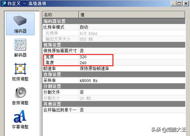 7、选择左边的编码器,我们可以在右则设置转换后的视频的大小,即宽度和高度