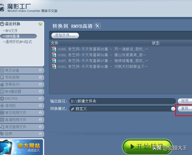 6、我们可以点击高级,对视频转换格式进行具体设置