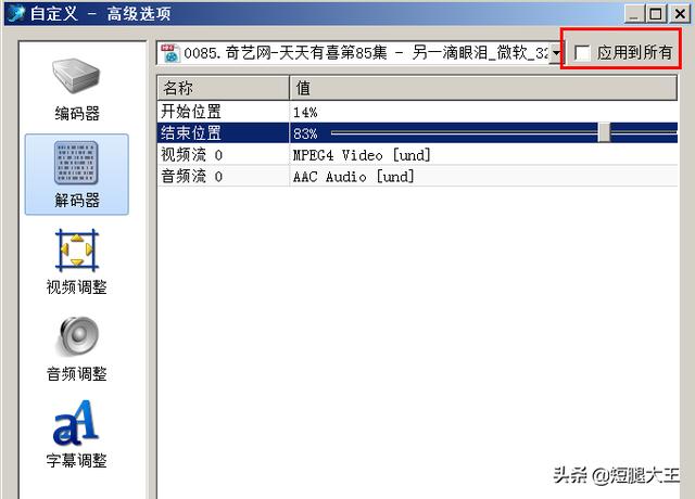9、值得注意的是,视频的开始或结束位置,只有在点选上"应用到所有"才会对所有视频生效,否则只对当前显示的视频生效