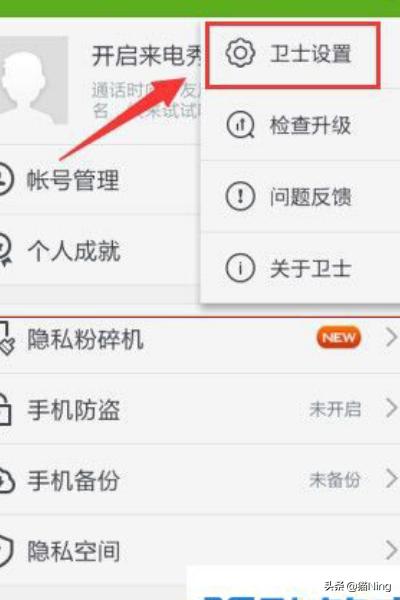 4、然后在弹出来的选项菜单中,点击选择“卫士设置”菜单。(如下图)