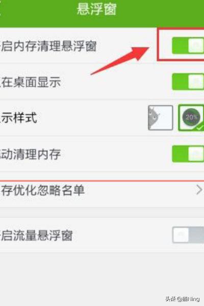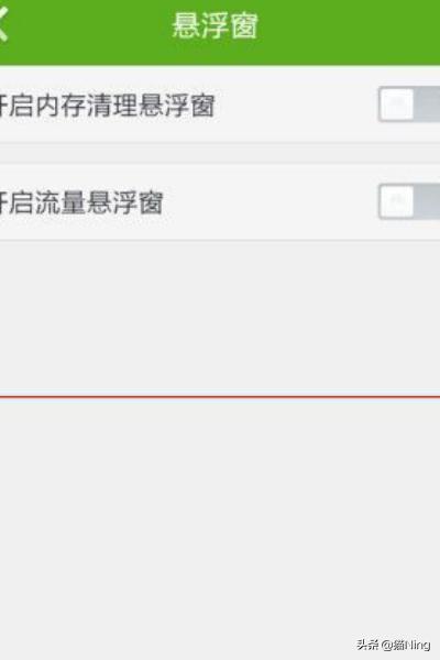 6、来到悬浮窗设置窗口,可以看到“开启内存清理悬浮窗”右侧是一个绿色的开启状态,用手指去点击,让它变成灰色的关闭状态。(如下图一、图二)