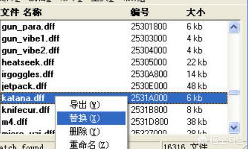 4、右击此文件选择”替换“选项,找到下载好的文件替换即可,(注:dff对应替换dff,txd对应替换txd。)