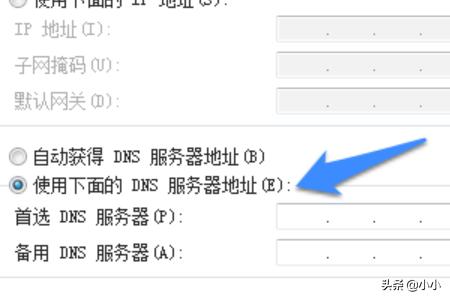 7、在 “TCP/IPV4”属性中,为当前网卡手动配置一个 DNS 服务器地址,选择“使用下面的 DNS 服务器地址”选项,如图所示