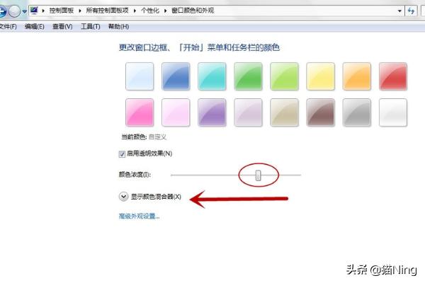 3、鼠标按住不放把颜色浓度(I)向左侧拖到尽头,将窗口颜色和外观调至透明状态。如图: