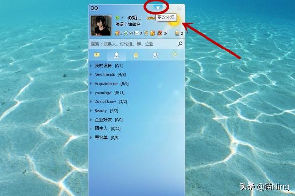 1、打开QQ鼠标移至QQ在面板最上方点击“更改外观”进入QQ的皮肤设置。