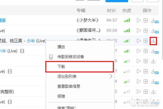 3、鼠标右键点击选择的那首歌曲,在新出现的下拉栏目中点击“下载”选项,或者直接点击歌曲右方的“下载”图标选项进行下载,在下载图标上显示蓝色VIP标识的图标则需要办理VIP会员才可以下载,如下图所示。