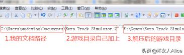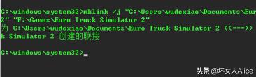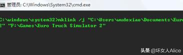 3.打开记事本,整合上面两个步骤的路径到命令中mklink /j "C:\Users\wudexiao\Documents\Euro Truck Simulator 2" "F:\Games\Euro Truck Simulator 2"