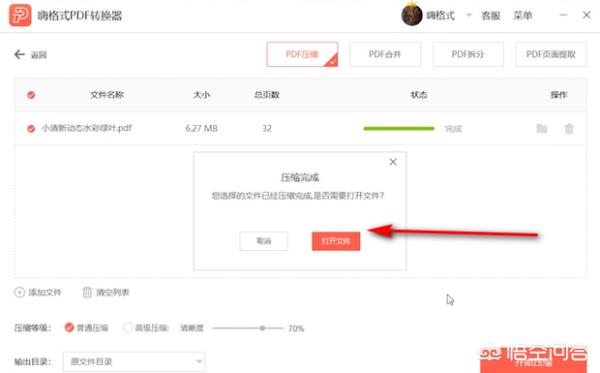 5、压缩完成后,点击【打开文件】,即可查看调整体积之后的pdf文件。