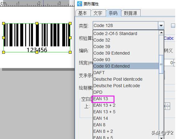打开条形码的属性,选择条形码的类型, 你需要什么的样类型就选择什么样的,如code128,EAN13,code39,codabar等等,以EAN13物理