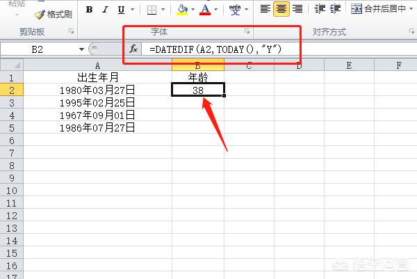 2、首先在B2单元格输入公式=DATEDIF(A2,TODAY(),"Y"),按enter键后则可得出结果,DATEDIF函数是指返回两个日期之间的年\月\日间隔数,这里“Y”表示年;