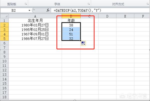 3、把鼠标放在B2单元格右下角,下拉填充公式,则可算出这列年龄了。