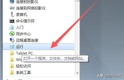 1、点击“开始”-》“附件”-》“运行”项,打开“运行”窗口,也可以按“Win+R”快速打开“运行”窗口。