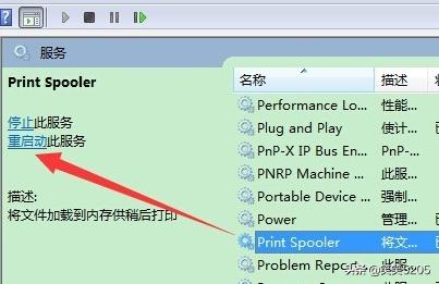 3、在打开的“服务”管理界面中,找到“Print Spooler”服务项,选中并点击左上角的“重启”或“重启动”按钮,重新启动该服务。