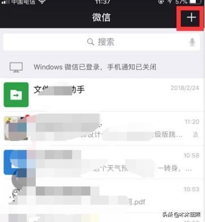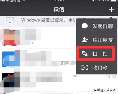 2、点击“+”号后,在出来的菜单中点击【扫一扫】